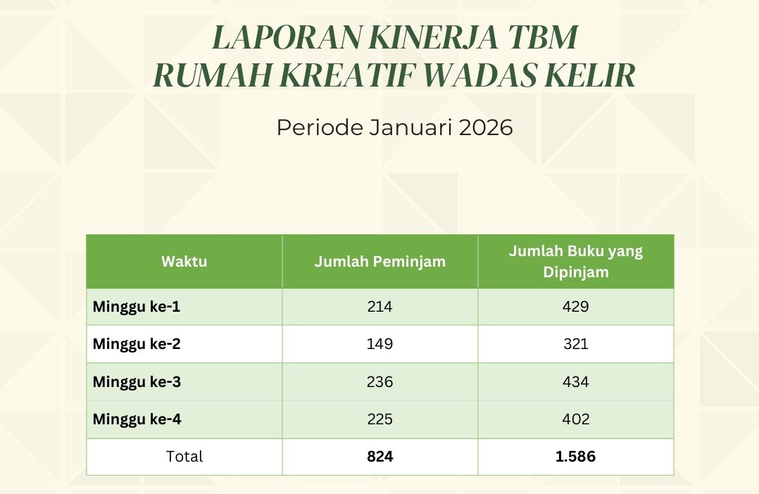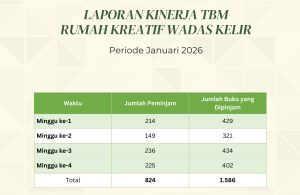 Salah satu kinerja yang konsisten dilakukan oleh Taman Bacaan Masyarakat (TBM) Rumah Kreatif Wadas Kelir setiap bulannya adalah pelaporan kinerja terkait dengan jumlah